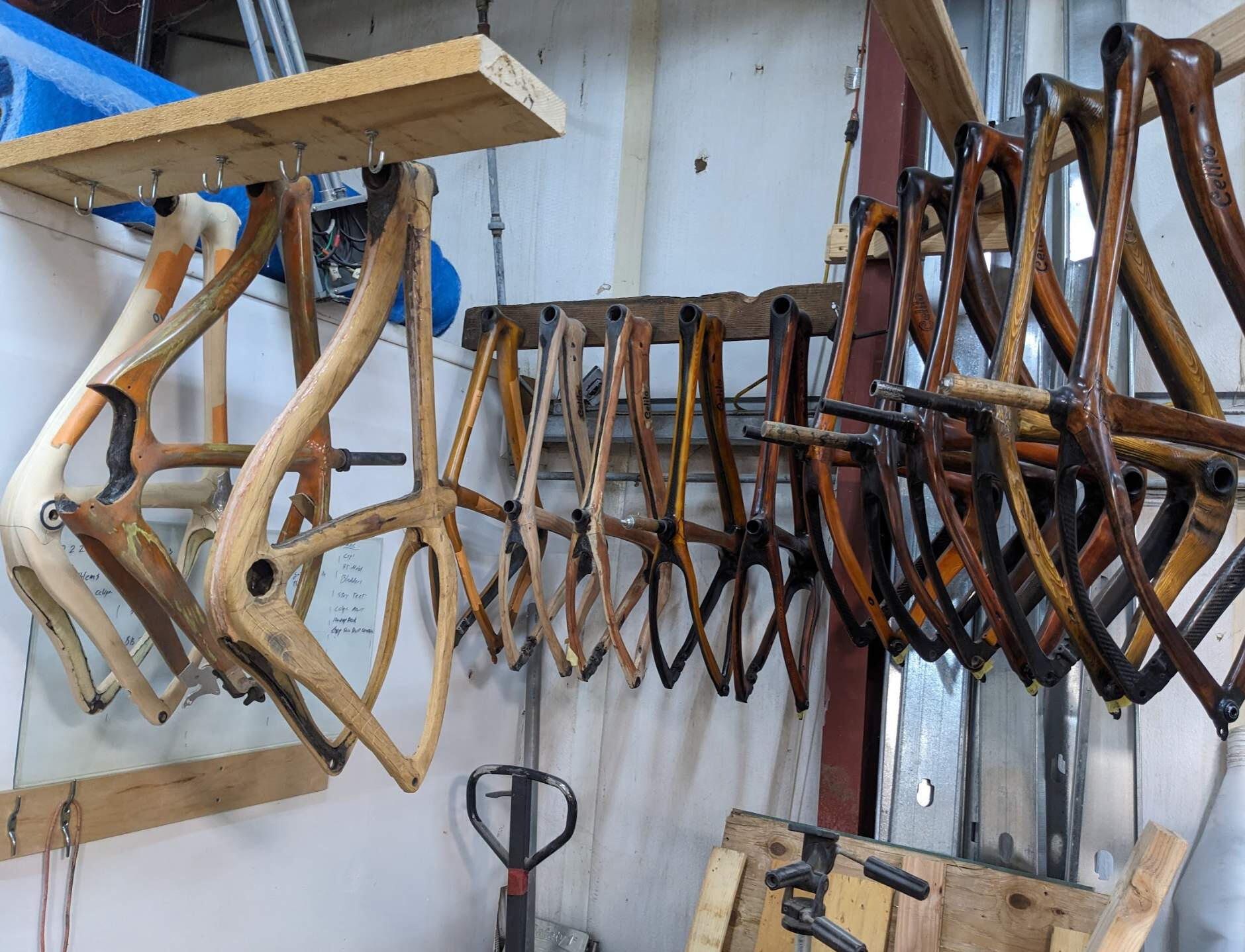 Since the first frame, the bikes have come a long way. What started as solid wood carvings have become completely hollow carbon fiber and Kevlar-reinforced frames. These bikes combine an artisan woodworker's skill and eye with modern manufacturing and material sciences. It survives the crash, absorbs the chatter, and looks better with a scratch.