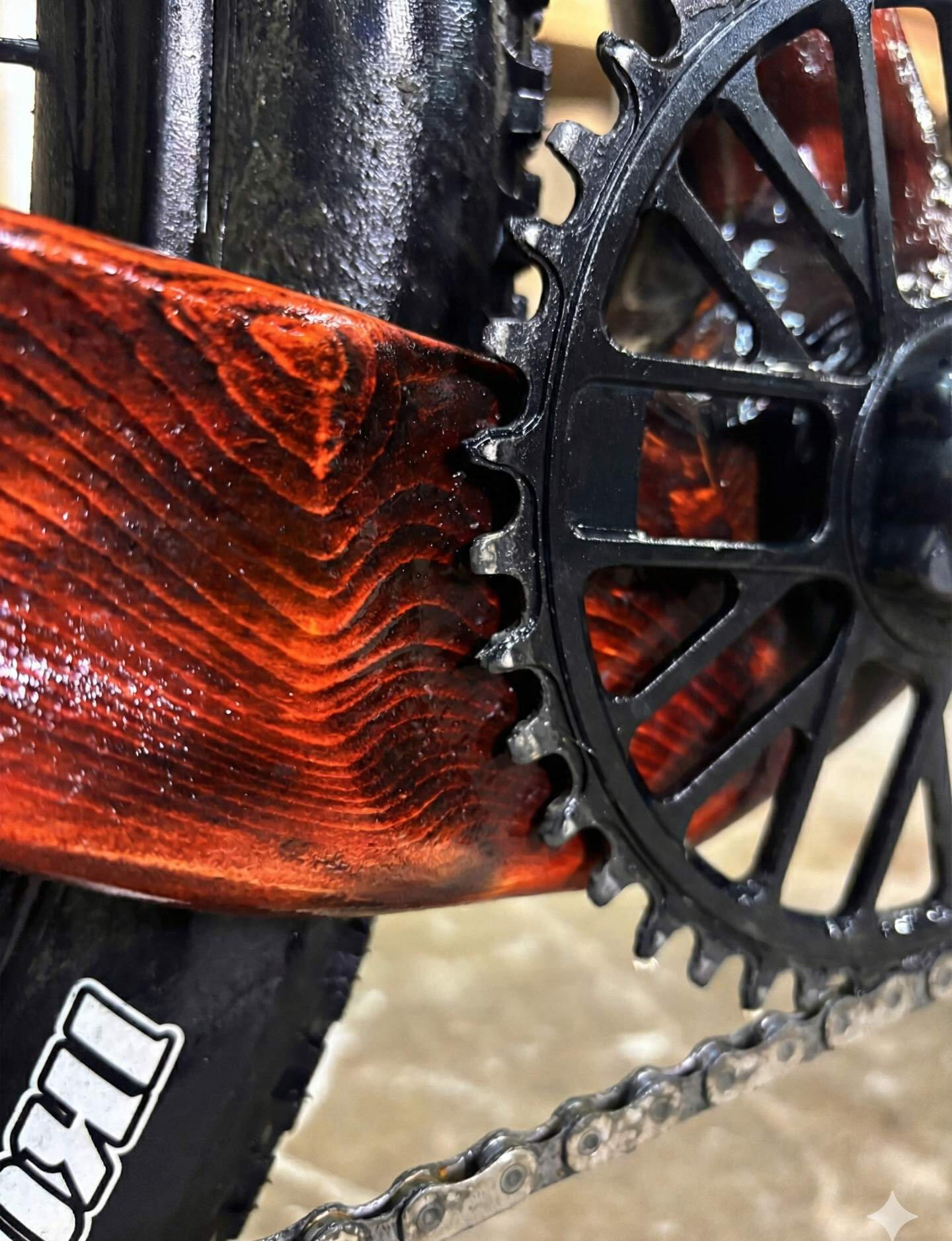 With two and a half inch knobby tires and a 120mm suspension fork the vibration damping of the wood is more subtle, but always present. On the trail, the wood earns its keep - reflecting rocks, absorbing impacts that would crack carbon. What you get instead are character-building scratches that prove you really ride it.