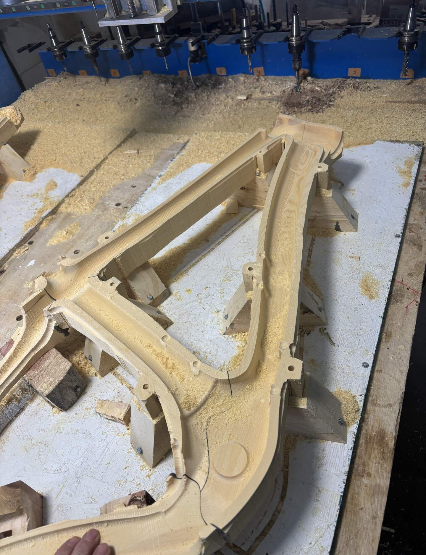 We use over a dozen different sanding implements on a single frame, switching between tools to soften machining marks on the complex curves and corners of the geometry. Sanding is the price we pay for working with wood. There is no shortcut. For twenty hours, we work through the grits, erasing the tool marks left by the robot, smoothing the transitions until the frame feels like a single, grown object. It is tedious, dusty, and absolutely necessary.