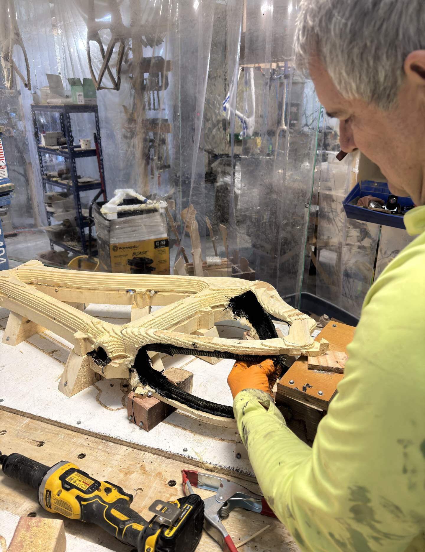 This is where wood meets carbon and Kevlar. Our machined wooden shells are reinforced with a strategic layup of carbon fiber and Kevlar, techniques borrowed from aerospace and other bike builders, but applied in a way that's unique to our frames. We custom make latex bladders for all of our frames for the best layup.